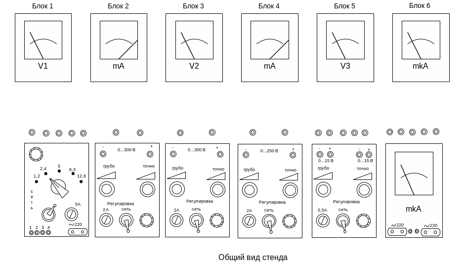 Блок 6 содержит два микроамперметра: с шунтом, увеличивающим его пределы до 10 мА М366: 0-75; 150; 300; 750 мкА, и М265 М: 0-100 мкА с шунтом, увеличивающим его пределы до 20 мА. На переднюю панель блока выведены две розетки для подключения приборов.