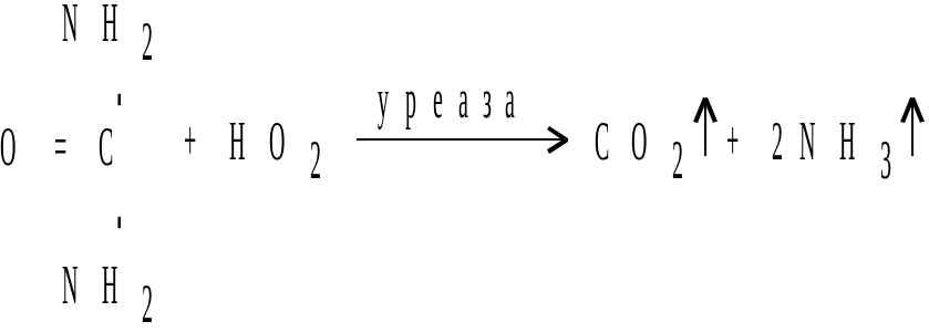Содержимое пробирок перемешивают легким встряхиванием и оставляют стоять при комнатной температуре на 15-20 мин. По истечении времени в пробирке, где был раствор мочевины, наблюдают изменение окраски индикатора, обусловленное накоплением в растворе аммиака при гидролизе мочевины уреазой. Гидролиз идет по схеме: