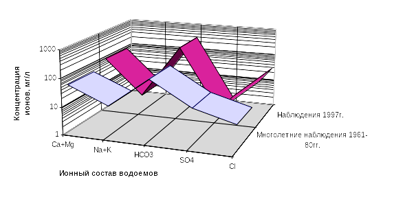 Рис. 19. Ионная концентрация поверхностных вод в 1997 году по сравнению