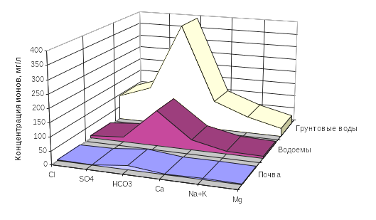По отношению к содержанию биогенных элементов в 1997 году наблюдается уменьшение содержания сульфат-иона и ионов натрия и калия по сравнению с прежними годами наблюдений, содержание же кальция, магния и гидрокарбонатного иона возрастает. Опасение вызывает все более усиливающаяся концентрация в водоемах иона хлора. Скорее всего, это связано с резким увеличением концентрации его в атмосфере, хотя хлор, являясь одним из самых мобильных элементов ландшафта, может быть также и индикатором загрязнения почв. В атмосферных осадках содержатся сульфаты, соединения азота, гидрокарбонаты и кальций, растворенные аммонийные соли и карбонаты. Резкое увеличение концентрации хлора в водоемах с одновременным уменьшением концентрации некоторых перечисленных выше элементов, содержащихся в атмосфере в больших количествах, чем хлор, наталкивает на мысль о несколько иной природе попадания хлора в воды ландшафта. Это можно сказать и в отношении ионов кальция. Здесь кальций, также как и хлор, выступает в роли индикатора интенсивности водно-эрозионных процессов.