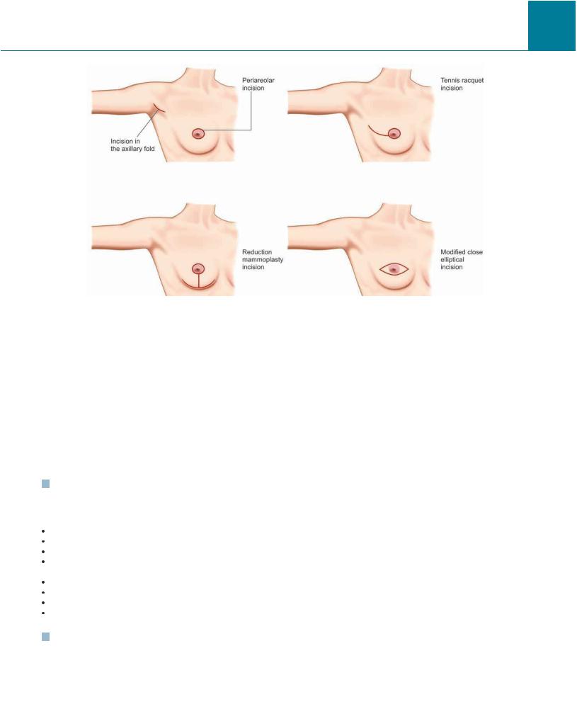 Incision is either periareolar/tennis racquet/modi ed elliptical. Tennis racquet has got lateral extension to axilla. Reduction mammoplasty incision is also used with a periareolar incision extending vertically into an inframammary horizontal incision. Prior biopsy site should be included in the mastectomy incision or should be removed widely through a separate elliptical incision (Fig. 16-26).