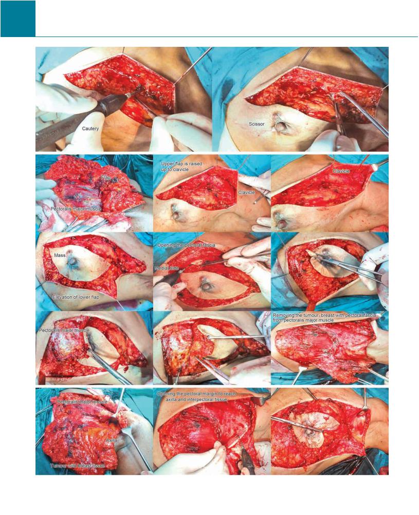 An elliptical incision is made from medial aspect of the second and third intercostals space enclosing the nipple, areola and tumour extending laterally into the axilla along the anterior axillary fold. Upper and lower skin aps are raised. Flap is raised mainly using scissor/scalpel/cutting cautery along with blunt gauze dissection in between. It extends medially up to the midline on the sternum; laterally to anterior margin of the latissimus dorsi muscle; above up to second rib/subclavius muscle; below 3 cm down the inframammary fold. Skin with subcutaneous fat is dissected o while raising the ap.