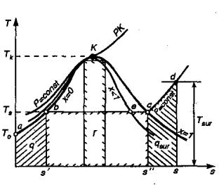 На рис. 2.8 процессы получения водяного пара изображены в диаграмме s - T. Здесь площади под процессами ab, bc и cd пропорциональны, соответственно q1, r и qsur;, где q1 – теплота жидкости, необходимая для