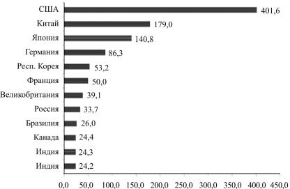 Россия, находясь в десятке лидеров по масштабам расходов на науку (рис. 7.4), существенно отстает от ведущих государств мира с точки зрения приоритетности инновационной сферы
