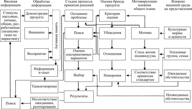 При этом крайне важны такие факторы внешней среды, как культурные нормы и ценности, мотивы и т.д., которые оказывают влияние на поведение потребителя на каждой стадии принятия решения. Иначе говоря, эта модель учитывает влияние, переходящее от общего к более конкретному, приходящее из внешней макросреды (эталонная группа, принадлежность к определенному социальному классу, нормы поведения) и переходящее на микроуровень (убеждения, намерения, отношения).