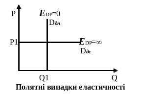 Якщо зміна ціни не викликає ніякої зміни попиту (тобто ЕDP0), тоді ми маємо досконало нееластичний попит. Якщо ж нескінченно мала змінна ціни викликає незкінченне розширення попиту (тобто ЕDP), тоді ми маємо досконало еластичний попит.