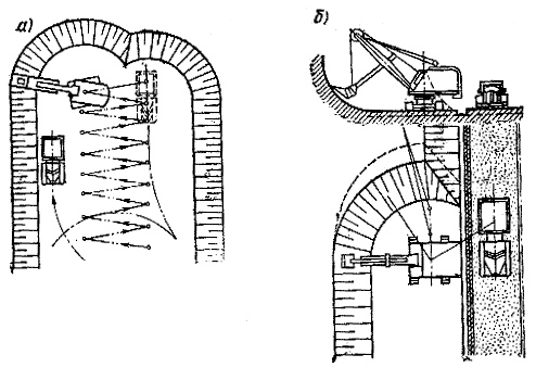 а - лобовая широкая проходка с погрузкой грунта в автотранспорт, перемещающийся по подошве забоя; б - боковая проходка с погрузкой грунта в автотранспорт