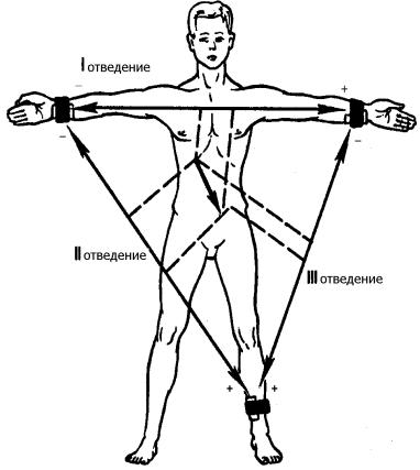 ризонтальной осям тела. Как было сказано ранее, его пациенты погружали в керамические сосуды, используемые в качестве погружных электродов, не только обе руки, но и одну ногу. Эйнтховен выбрал левую ногу, вероятно, потому, что она расположена на вертикали проходящей через сердце. Таким образом, у первых электрокардиографов было три электрода, из которых только два использовались одновременно. При введении в практику электронных усилителей возникла необ-