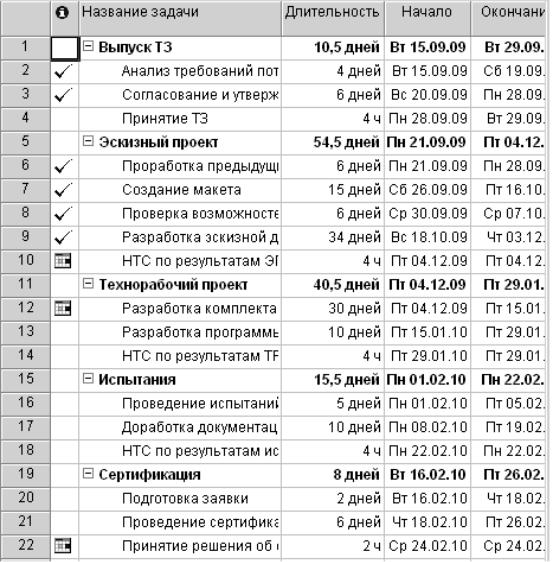 В поле Название указывается описание работы. Поле Длительность содержит период времени в часах или днях, который занимает работа. В полях Начало и Окончание указывают соответственно дату начала и конца работы. Если длительность работы нельзя определить точно, то ставится флажок в поле Предв. оценка.