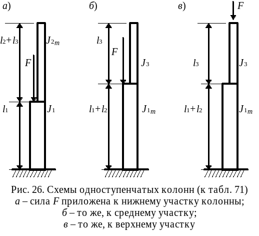 где mm1, mm2, mm3 – коэффициенты, определяемые по табл. 71 как для одноступенчатых колонн по схемам рис. 26; b1 = F1/F3; b2 = F2/F3; d2 = l2/l1;