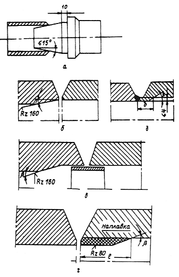 б) механическая обработка (расточка) по внутренней поверхности конца трубы с меньшим диаметром в соответствии с рис. 4.3, б (для стыка без подкладного кольца) или 4.3, в (для стыка с остающимся подкладным кольцом) при условии, что толщина стенки трубы после расточки будет не меньше расчетной. Этот способ можно применять для труб из любой стали. Угол выхода резца должен быть не более 6° на трубах из аустенитной стали и не более 15° из других сталей;