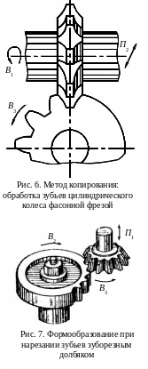 На рис. 3.6 показан пример обработки зубьев цилиндрического колеса фасонной дисковой фрезой. Контур режущей кромки фрезы совпадает с профилем впадин. Направляющая линия получается прямолинейным движение заготовки вдоль своей оси. Здесь необходимы два формообразующих движения: вращение фрезы ФV(B1) и ее прямолинейное перемещение ФS(П2). Кроме этого, для обработки последующих впадин заготовка должна периодически поворачиваться на угол (делительное движение Д(В3)), соответствующий шагу зацепления.