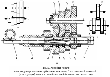 Ниже рассмотрены лишь коробки подач с зубчатыми передачами. Коробки подач с зубчатыми передачами бывают со сменными зубчатыми колесами с постоянными расстояниями между осями валов, с передвижными блоками зубчатых колес, со встречными ступенчатыми конусами колес и вытяжными шпонками, в форме гитар сменных зубчатых колес.