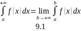 Если предел (9.1) существует и конечен, то говорят, что интеграл сходится, и предел берется за значение интеграла, а если предел не существует или бесконечен, то говорят, что интеграл расходится.