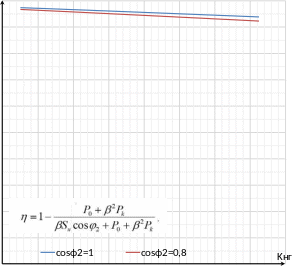 Изменение коэффициента нагрузки принять в пределах 01,2 для не менее пяти по возможности равномерно распределенных значений. Результаты расчетов для двух значений cos 𝜑2 = 𝑐𝑜𝑛𝑠𝑡 представляют в виде таблицы 3 и строят в одних осях координат две зависимости 𝜂 = 𝑓(𝐾НГ) рис. 11.