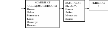 В результате сбора информации повышается осведомленность потребителей об имеющихся на рынке марках и их свойствах. До начала сбора информации Бетти знала только несколько марок фотокамер из полного комплекта доступных потребителю фотоаппаратов (см. крайний левый прямоугольник на рис. 35). Знакомые ей марки камер составляли ее комплект осведомленности. Вновь поступающая информация расширила рамки этого комплекта, а дополнительная информация помогла отсеять ряд марок из числа рассматриваемых. Оставшиеся марки, которые отвечали ее покупательским критериям, составили комплект выбора. Из этого комплекта Бетти и сделает свой окончательный выбор19.