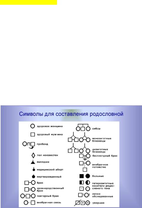 ●клинико-генеалогический метод (сбор врачом генеалогических данных, необходимых для последующего составления и анализа семейной родословной пробанд).