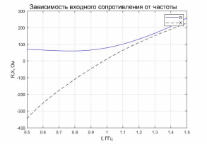 Результаты расчета отражаются в виде графика зависимости активной и реактивной составляющей входного сопротивления от частоты. Приведен график такой зависимости для следующих значений исходных данных:
