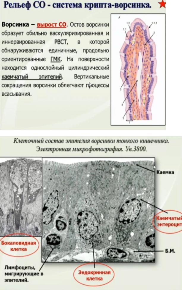Кишечные ворсинки (villi intestinales) представляют собой выпячивания слизистой оболочки пальцевидной или листовидной формы, свободно вдающиеся в просвет тонкой кишки. У новорожденных и в раннем постнатальном периоде форма ворсинок пальцевидная, а у взрослых уплощенная — листовидная (или языковидная). Ворсинки уплощенной формы имеют две поверхности — краниальную и каудальную и два края (гребни). Число ворсинок в тонкой кишке очень велико. Больше всего их в двенадцатиперстной и тощей кишке (22—40 ворсинок на 1 мм2), несколько меньше — в подвздошной кишке (18—31 ворсинка на 1 мм2). В двенадцатиперстной кишке ворсинки широкие и короткие (высота их 0,2—0,5 мм), в тощей и подвздошной кишке они несколько тоньше, но выше (до 0,5—1,5 мм). В образовании каждой ворсинки участвуют структурные элементы всех слоев слизистой оболочки.