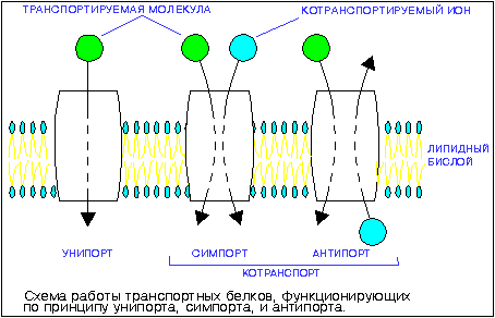 Более сложная функция переносчиков-транспортировать два растворенных вещества совместно, так что перенос одного зависит от одновременного переноса другого в том же самом направлении (симпорт) или в противоположном направлении (антипорт).