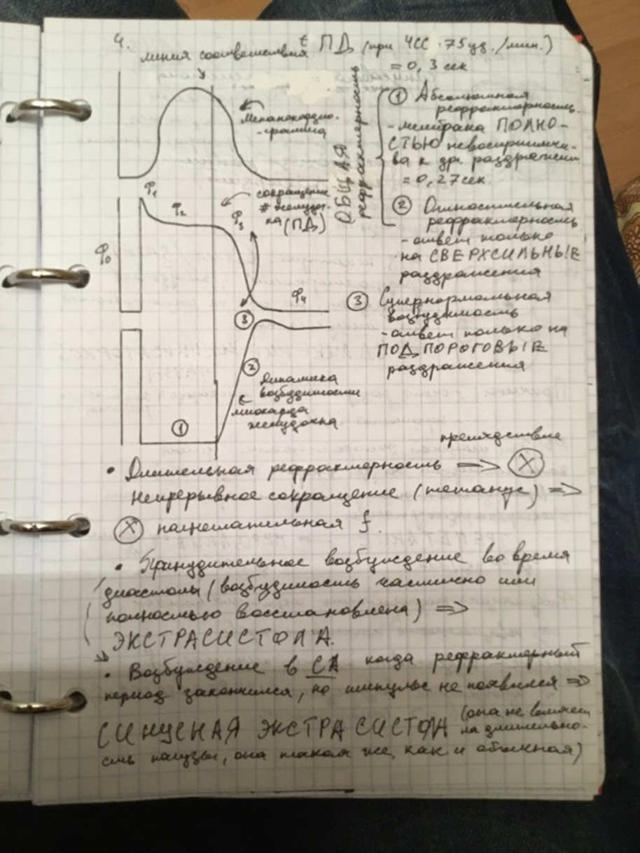 Ответ: У кардиомиоцита в отличие от других мышц фаза абсолютной рефрактерности значительно дольше и охватывает не только фазу деполяризации, но и следующие за ней быструю начальную реполяризацию и медленную реполяризацию. Абс рефрактерность продолжается вплоть до закрытия Са каналов, 0.27 сек из примерно 0.3 сек всего ПД клетки. Поэтому тетанус невозможен. Графики рисовать обязательно.