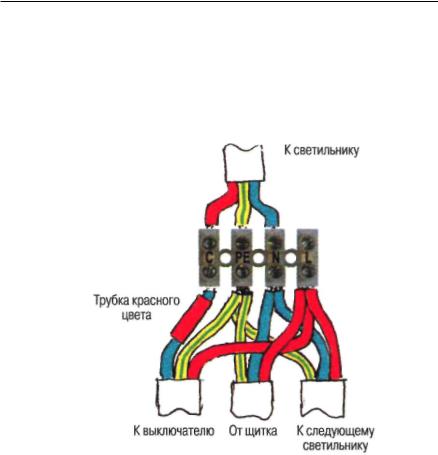 При очень простой принципиальной схеме монтажная схема клеммной колодки на четыре клеммы уже достаточно сложная. Обратите внимание на расположение проводников. На проводник, идущий от выключателя к клемме «С» и имеющий голубой цвет изоляции, соответствующий линии N, надевают изолирующую трубку красного цвета, чтобы подчеркнуть, что этот проводник иногда находится под напряжением.