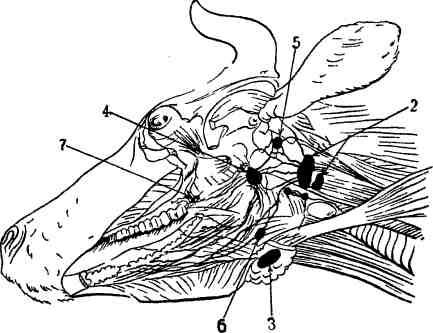 Лимфатические узлы: 1—поверхностный шейный; 2—надколенный; 3—седалищный; 4—подколенный.