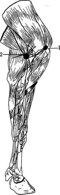2. Надколенный лимфатический узел (2), дли ной до 6—11 см, лежит по краю напрятателя ши рокой фасции бедра.