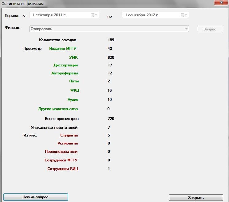 Рис. 32. Просмотр статистики по филиалам МГГУ