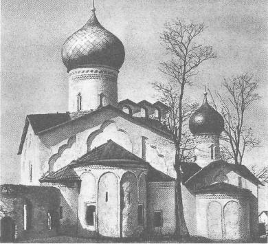 В 1362 г. рухнул верх псковского Троицкого собора. В 1365—1367 гг. здание восстановили, причем, как отмечено в летописях, «по старой основе». Собор был уничтожен в конце XVII в., но известен нам по достаточно реалистическим изображениям (план и фасад). Судя по этим изображениям, основное здание сохранилось еще от домонгольского времени и восстановление коснулось лишь верхней части церкви, которую исполнили в виде ступенчатого пьедестала, перекрытого восемью двускатными кровельками (т. е. на 16 скатов). Зодчий здесь как бы продолжил творческую переработку завершения крестовокупольного храма, начатую еще на рубеже XII и XIII вв. Троицкий собор — главный храм города — венчал детинец Пскова (здесь он назывался Кром) и служил символом псковской независимости. Величественная и динамичная композиция Троицкого собора, несомненно, должна была оказать влияние на последующее развитие псковского зодчества, хотя история Пскова более не выдвигала перед архитектурой задач такого масштаба и идейного значения.
