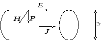 На поверхности проводника напряженности электрического и магнитного полей направлены так, как показано на рис. 13.5. Их модули соответственно равны