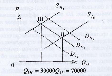 Купив подержанный автомобиль «счастливый» владелец в процессе эксплуатации через достаточно короткий период времени совершенно точно установит, к какому типу (Н или L) принадлежит его автомобиль. Это неизбежно, ибо на рынке реально существуют, продаются и покупаются только эти два типа подержанных автомобилей, а автомобиль среднего качества (типа М) существует в голове покупателя только идеально, в процессе установления цены покупки. Однако поведение новых потенциальных покупателей на рынке подержанных автомобилей в условиях асимметричности информации описывается именно функцией спроса на автомобили среднего качества (типа М), причем имеется в виду ожидаемое среднее качество, подтвержденное опытом эксплуатации подержанных автомобилей, купленных ранее.