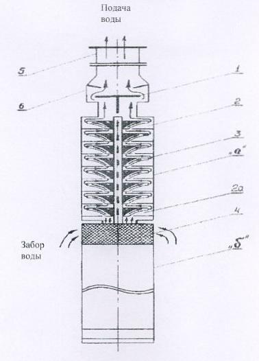 При работе агрегата вода через фильтр 4 поступает в первую секцию, в которой лопастями (лопатками) рабочего колеса 3 отбрасывается на периферию.