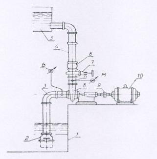 К насосу 8, жидкость поступает из приемного резервуара 1 по подводящему трубопроводу 3. Насос нагнетает жидкость в напорный pезеpвyap 5 по напорному трубопроводу 4. На напорном трубопроводе имеется регулирующая задвижка 7, при помощи которой изменяется подача насоса.