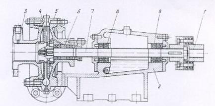 Рабочее колесо 4 укреплено на конце вала 7 с помощью гайки и шпонки. Цельнолитая спиральная камера 5 с напорным патрубком (НП) болтами крепится к опорной раме 4. Торцевая расточка, диаметр которой несколько больше диаметра рабочего колеса, закрыта крышкой 3, отлитой вместе с всасывающим патрубком (ВП). В случае необходимости можно, сняв крышку 3. извлечь рабочее колесо 4, не производя полной разборки насоса. Вал насоса 7 крепится в шариковых подшипниках 8, установленных в расточки рабочей опорной рамы, часть которой образует ванну, заполняемую маслом. На конце вала посажена полумуфта, которая смыкается с полумуфтой 1, насаживаемой на конец вата электродвигателя.