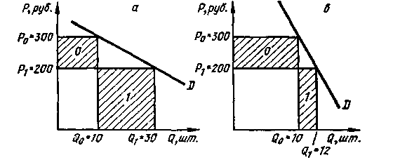 Пример 3. На рисунке 23 изображены два варианта графиков спроса. На рисунке 23, а снижение цены с Р0 до Р1 на 100 руб. (на 33%) приведет к росту величины спроса с Q0 до Q1 на 20 шт. (на 200%). Коэффициент эластичности будет равен 6 (200:33), т.е. больше 1, и спрос эластичен. Выручка от реализации продукции увеличится с 3000 (300x10) до 6000 руб. (200x30), т.е. вырастет в два раза. Заштрихованные прямоугольники 0 и 1 показывают увеличение выручки от реализации продукции при снижении цены в условиях эластичного спроса. Площадь прямоугольника 1 больше площади прямоугольника 0.