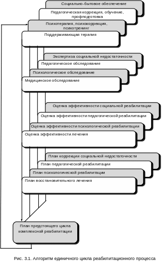 Процесс реабилитации, как было указано выше, имеет циклическую структуру. В каждый реабилитационный цикл, который условно можно считать начинающимся с комплексной экспертизы, включающей в себя также оценки эффективности реабилитационных мероприятий предыдущего законченного цикла реабилитации и составление планов таких мероприятий на предстоящий цикл, в качестве главного и основного звена входит реализация собственно самих реабилитационных мероприятий: лечебная и поддерживающая терапия, различные виды психологической поддержки ребенка и его семьи, направленные воспитание и обучение, в том числе профессиональное обучение, различные виды социальной поддержки. Алгоритм единичного цикла реабилитационного процесса показан на рис.3.1. Содержание блоков этого алгоритма может быть различно в зависимости от сроков выявления заболевания туберкулезом, возраста ребенка и порядкового расположения данного реабилитационного цикла в общей цепи реабилитационных циклов.