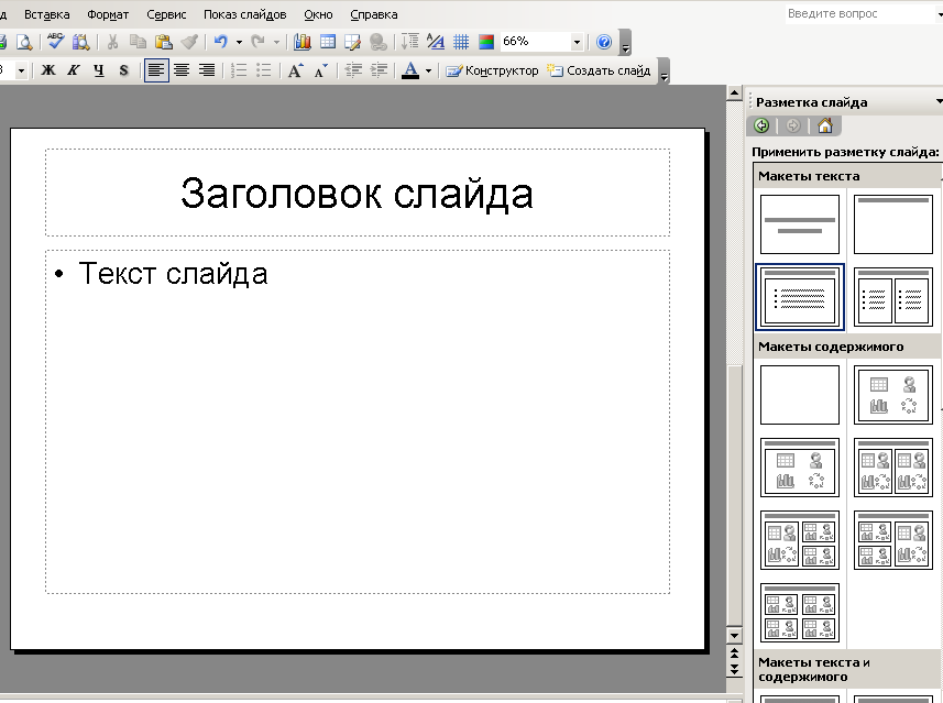 Вставка Создать слайд Разметка слайда Заголовок и текст