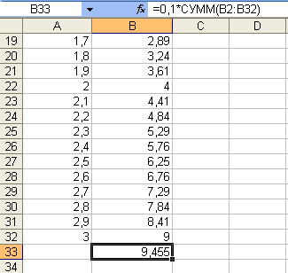 Теперь в ячейке ВЗЗ может быть найдено приближенное значение интеграла, для чего в ячейку ВЗЗ вводим формулу =0,1*, затем вызываем Мастер функций. В поле Функция выбираем функцию Сумм и нажимаем кнопку ОК. В рабочее поле диалогового окна СУММ мышью определяем диапазон суммирования ВЗ:В32, заполняя поле Число1 и нажимаем кнопку ОК. В ячейке ВЗЗ появляется приближенное значение искомого интеграла (9,455). На рис.4.46. приведен фрагмент таблицы для вычисления интеграла.