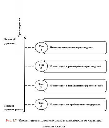 Разумеется, всегда следует помнить и об уровне инвестиционного риска, который зависит от характера инвестирования, влияющего на степень потенциальных неудачных вложений (рис. 1.7).