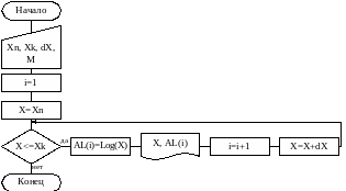 Private Sub CommandButton1_Click() Dim X As Single, Xn As Single, Xk As Single, dX As Single Dim M As Integer, AL() As Single, i As Integer Xn = InputBox("Начальное значение X=") Xk = InputBox("Конечное значение X=") dX = InputBox("Шаг изменения X=") M = InputBox("Размерность AL=") ListBox1.AddItem " X AL" ListBox1.AddItem "___________________" ReDim AL(1 To M) i = 1 X = Xn Do While X <= Xk AL(i) = Log(X) ListBox1.AddItem Format(X, "00.0") & " " & Format(AL(i), "0.000") i = i + 1 X = X + dX Loop End Sub