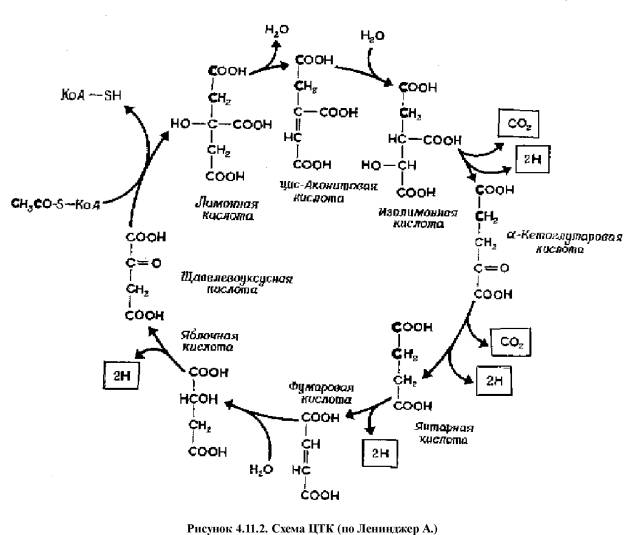В ходе реакции лимонная кислота подвергается различным реакциям в результате отщепляется два углеродных атома в виде СО2 и вновь образуется ЩУК. Одна молекула ЩУК может вступать в реакции с огромным количеством ацетил КоА. Выходом этой реакции являются СО2 и Н2О.