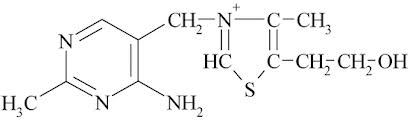 Витамин В1, состоит из пиримидинового и тиазолового колец, соедененых между собой. Наличие S в тиазоловом кольце и аминогруппы в пиримидиновом кольце дало основание назвать вещество тиамином.