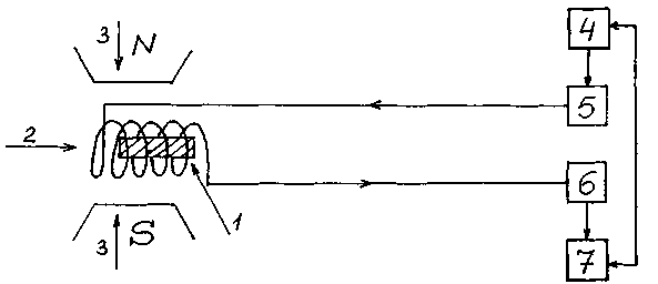 Рис. 8.21. Блок-схемаЯМР-томографа: 1 -досліджуваний об'єкт; 2 - котушка (соленоїд); 3 - магніт; 4 - імпульсний генератор; 5 - радіочастотний передавач; 6 - приймач; 7 - комп'ютер.