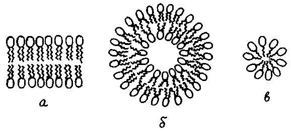Рис. 4.17. Самозбірка фосфоліпідів у водному розчині: а - ліпідний бішар; б - везикула (ліпосома); в - міцела.
