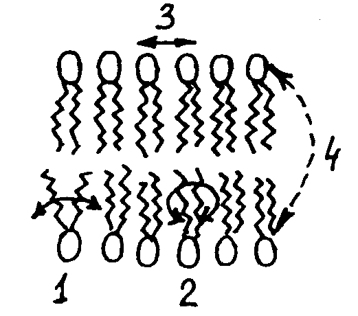 Рідкі кристали - це особливий стан деяких речовин, переважно органічних, якому притаманна плинність (як рідині), але молекули при цьому зберігають впорядкованість у розташуванні, що спонукає до анізотропії ряду фізичних властивостей (як у кристалів). Згідно з цим уявленням, бішар - це рідка структура, в якій молекули ліпідів здатні здійснювати сегментальну рухливість, обертальні рухи і латеральну дифузію, що являє собою послідовний обмін місцями у межах одного шару (рис. 4.19).
