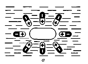 Однако, при определенном значении рН степень диссоциации амино- и карбоксильных групп приобретает одинаковые значения, тогда молекулы белков становятся электронейтральными. Значение рН, при котором молекула белка находится в электронейтральном состоянии, носит название изоэлектрической точки (ИЭТ). Для большинства белков ИЭТ лежит в области кислых растворов. В частности, для желатина — 4,7; козеина молока — 4,6; Y-глобулина крови — 6,4; пепсина — 2,0; химотрипсина — 6,0 ; альбумина яичного — 4,7; фармагеля А — 7,0; фармагеля В — 4,7. Необходимо учитывать ИЭТ, так как установлено, что от ее величины зависит устойчивость белков, а следовательно, и проявление их свойств. В некоторых случаях возможно даже выпадение белков в осадок. Это связано с тем, что в ИЭТ по всей длине белковой молекулы находится равное количество положительно и отрицательно заряженных ионогенных групп, что приводит к изменению конфигурации молекулы. Гибкая молекула сворачивается в клубок в силу притяжения разноименных ионов (рис. 111).