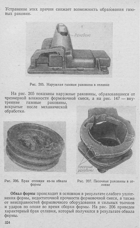 Песочные раковины (рйс. 207) возникают вследствие низкой прочности и влажности формовочной смеси, недостаточной, поверх ностной прочности стержня, слабого уплотнения и плохой про дувки формы сжатым воздухом перед ее сборкой; кроме того, отдельные комочки и песчинки смываются струей металла во время заливки и заносятся в отливку. Этот брак можно устранить нор мальным уплотнением формы, тщательной ее продувкой в процессе сборки и тщательной отделкой литниковой воронки; не следует допускать длительного выстаивания формы перед заливкой.