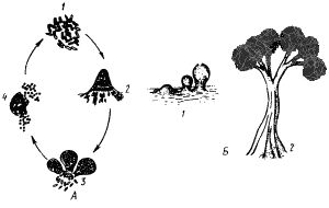 Рис. 21. Цикл развития и плодовые тела некоторых миксобактерий: А — цикл развития Myxococcus: 1 — активно размножающиеся вегетативные клетки; 2 — скопление клеток, предшествующее образованию плодового тела; 3 — плодовое тело; 4 — миксоспоры; Б — плодовые тела: 1 — Myxococcus; 2 — Chondromyces (no Schlegel, 1972) |