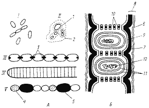 Рис. 24. Межклеточные контакты у разных представителей цианобактерий (А) и микроплазмодесмы у нитчатых форм (Б). 1 —Synechococcus; II — Gloeothece; III — Pseudoanabaena; IV— Oscillatoria; V — Anabaena: 1 — чехол, окружающий каждую клетку; 2 — сохранившийся чехол материнской клетки; 3 — полярные газовые вакуоли; 4 — гетероциста; 5 — акинета; 6 — наружная мембрана; 7 — пептидогликановый слой; 8 — клеточная стенка; 9 — ЦПМ; 10 — микроплазмодесмы; 11 — тилакоиды; 12 — нуклеоид |